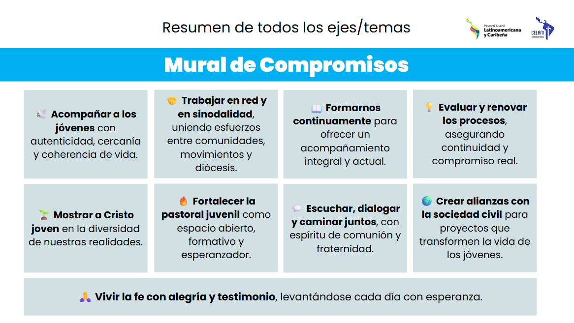 - Fomentar la sinodalidad y el trabajo en red entre comunidades, diócesis y movimientos, fortaleciendo además la vinculación con la Red Latinoamericana de Centros e Institutos de Pastoral Juvenil, como espacio de articulación, formación y apoyo.